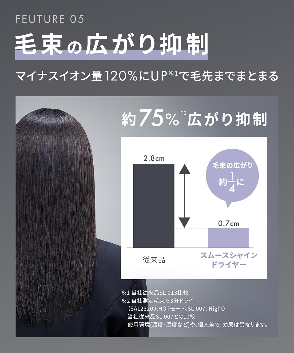內建提升的負離子輸出,幫助髮絲減少毛躁、增加光澤,吹整後擁有如絲般柔順觸感。